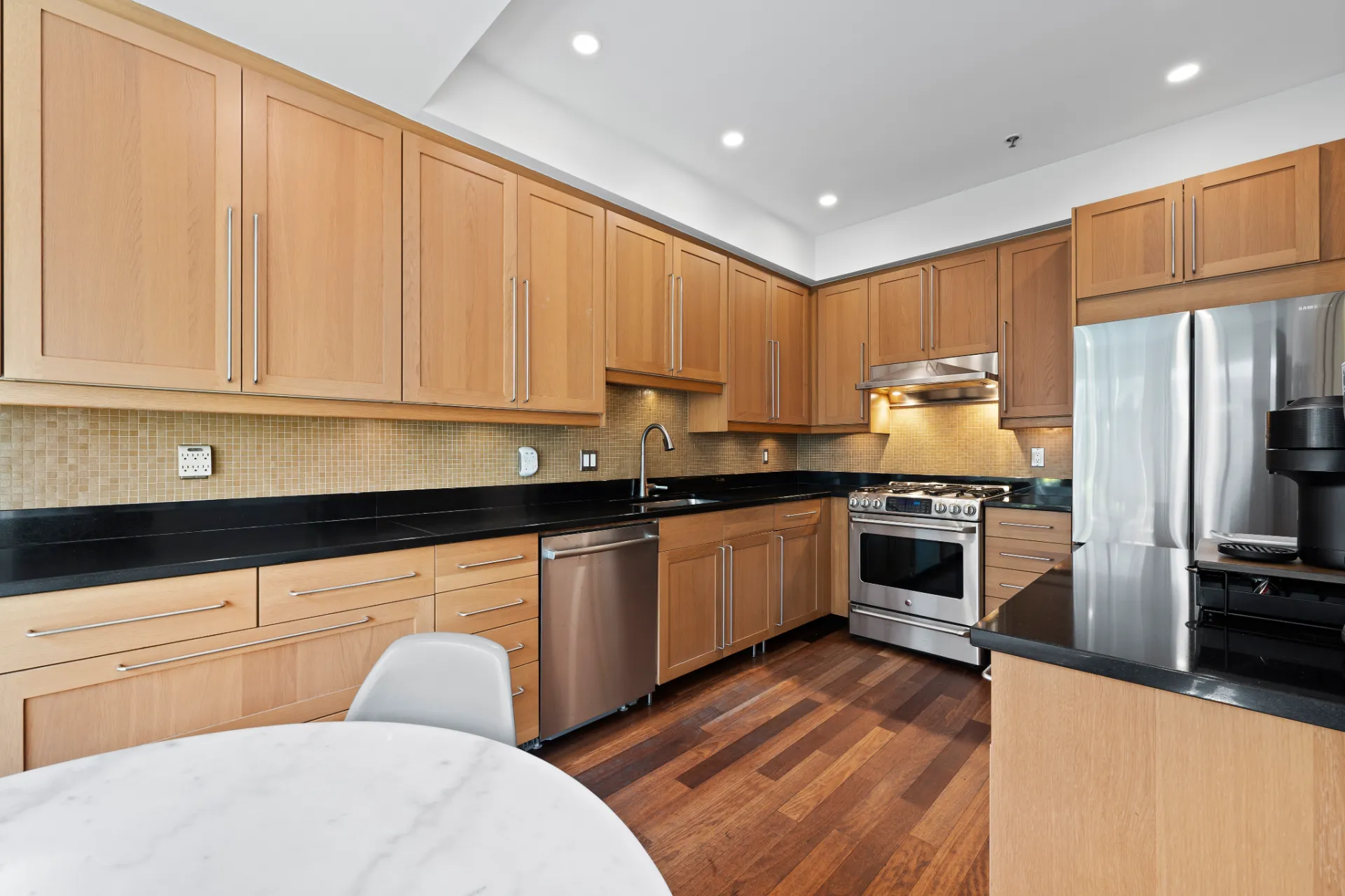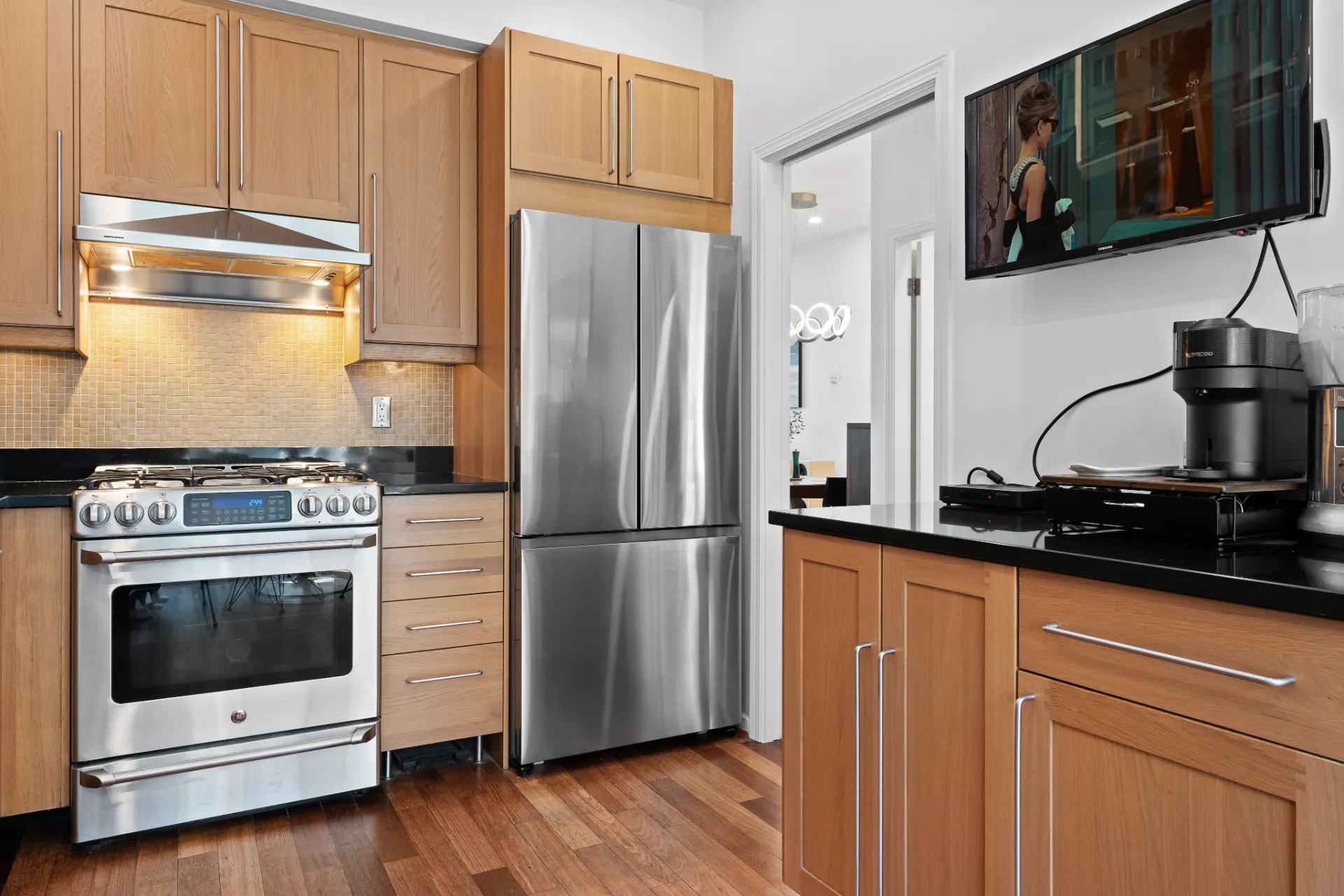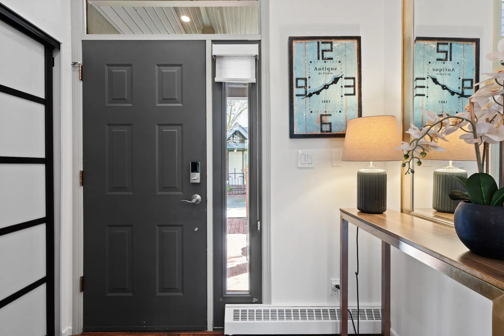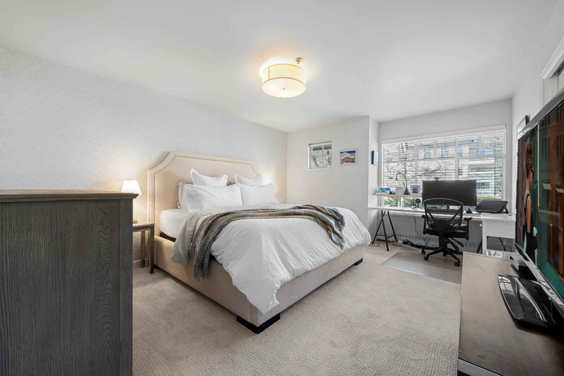 The updated kitchen is a chef’s dream, complete with stainless steel appliances, including a new fridge and gas range, soft-close walnut cabinetry, and 2” mitered quartz countertops. Upstairs, two generous bedrooms each enjoy their own fully remodelled ensuite, featuring radiant in-floor heating, frameless showers, Brizo faucets, and Duravit sinks and toilets. The lower level offers a versatile third bedroom or family room, perfect for a media space, home office, or guest suite.