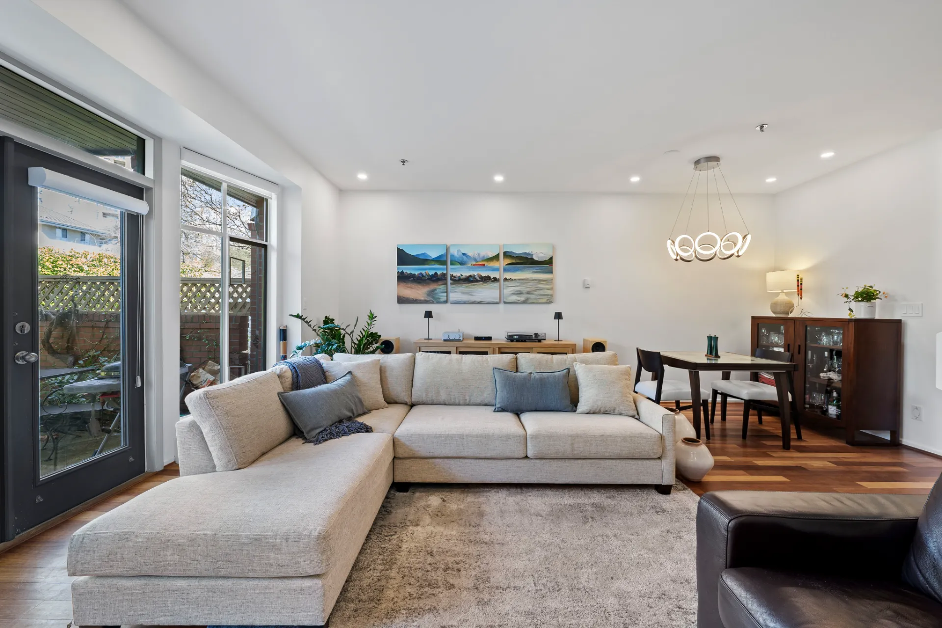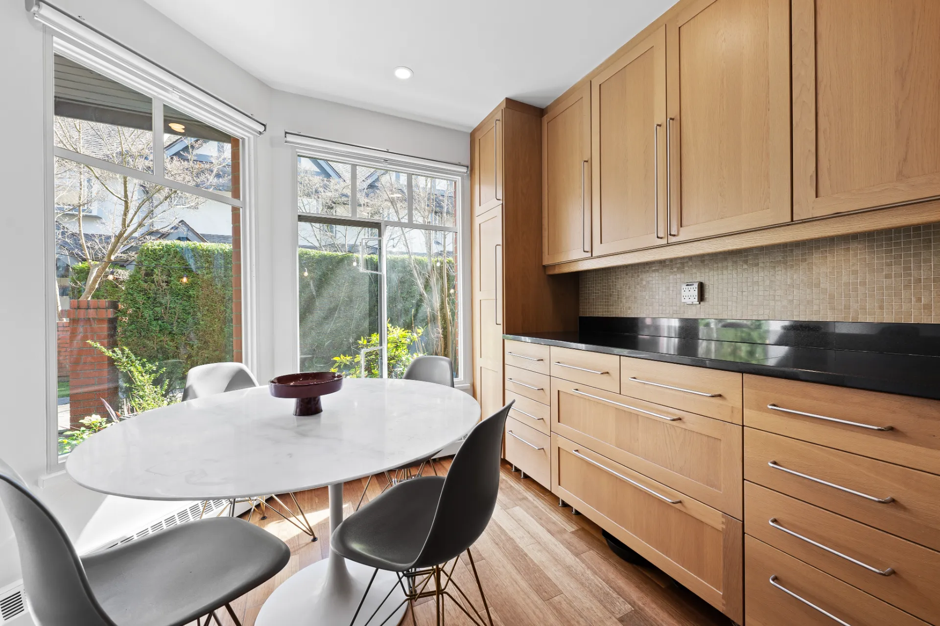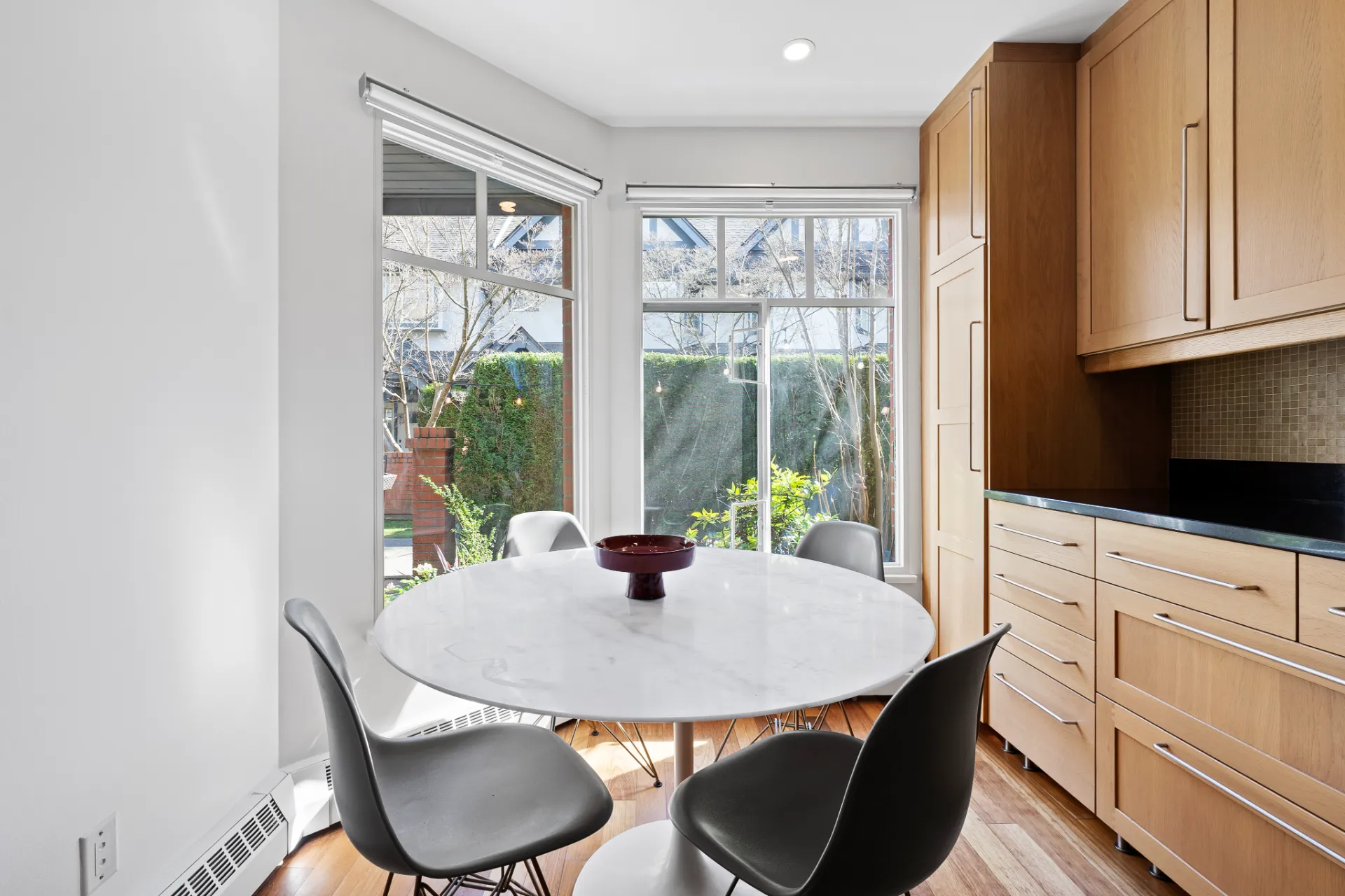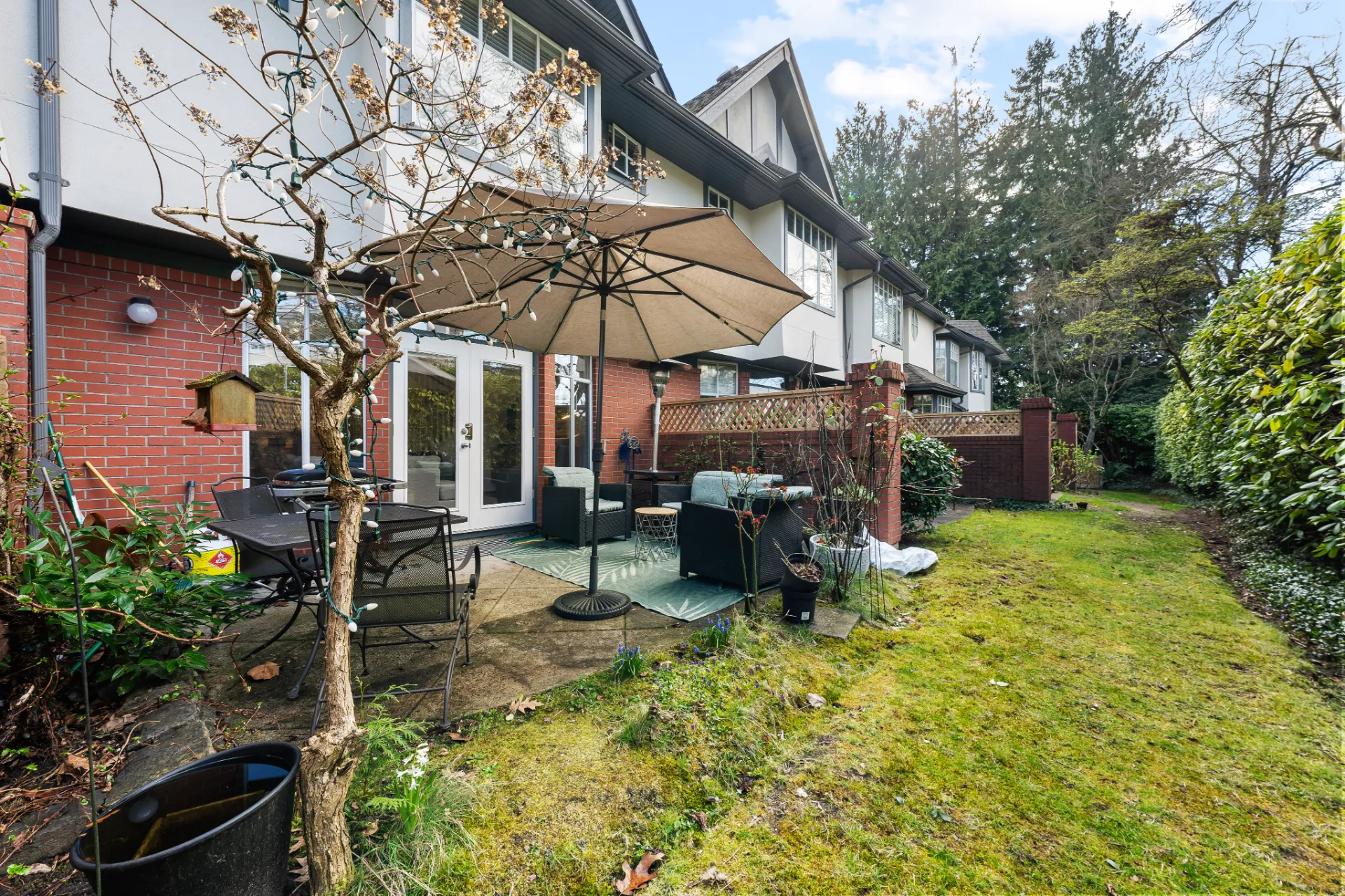 Welcome to this beautifully renovated 3-level townhouse at Thames Court, one of UBC’s most sought-after communities. Offering approximately 1,700 sq. ft. of thoughtfully designed living space, this home combines modern updates with timeless charm. The main floor features rich hardwood flooring, newly painted walls, and a striking gas fireplace with floor-to-ceiling honed marble facing. Recessed LED lighting throughout the main floor adds a contemporary touch, creating a bright, welcoming space perfect for everyday living and entertaining. French doors lead to a private rear patio, while the sunny south-facing front patio provides a tranquil outdoor retreat.