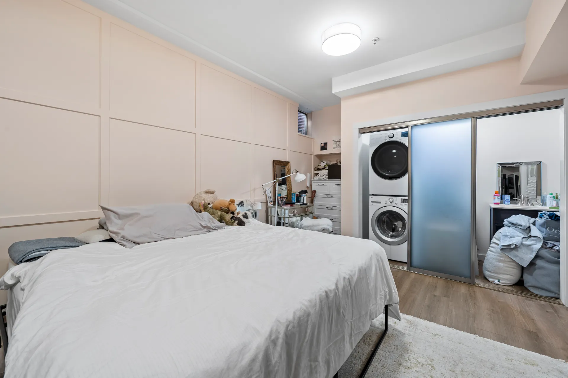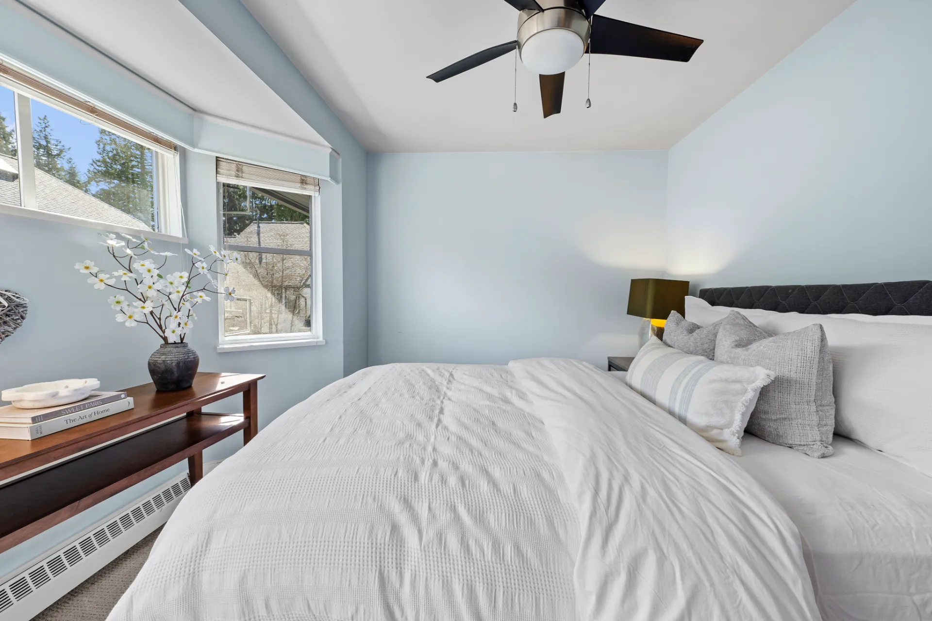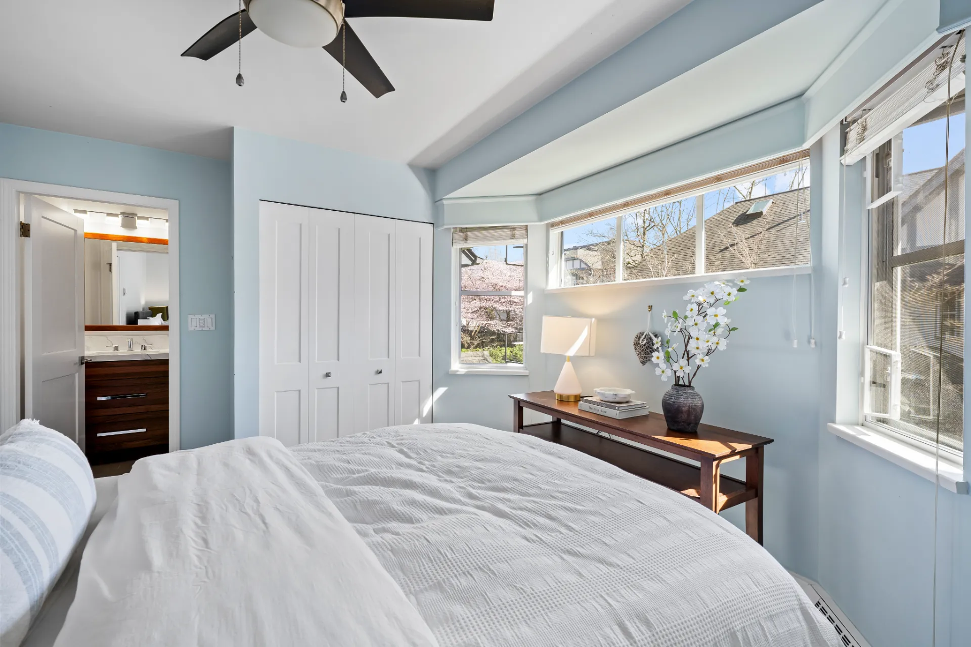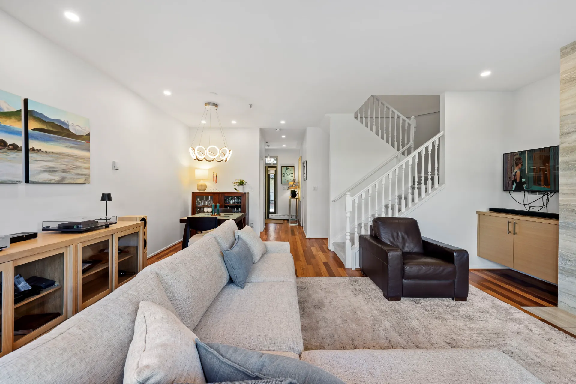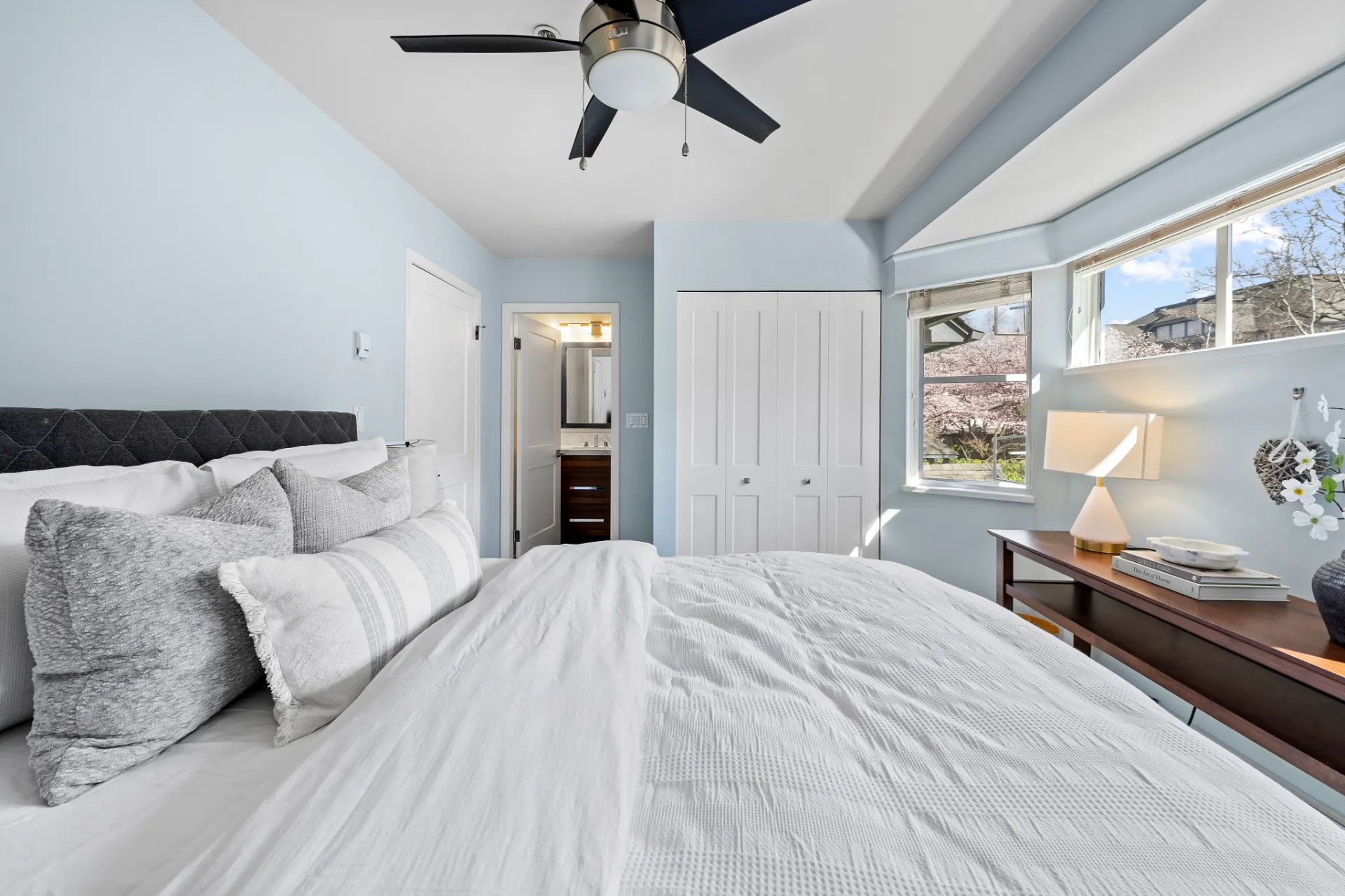 The updated kitchen is a chef’s dream, complete with stainless steel appliances, including a new fridge and gas range, soft-close walnut cabinetry, and 2” mitered quartz countertops. Upstairs, two generous bedrooms each enjoy their own fully remodelled ensuite, featuring radiant in-floor heating, frameless showers, Brizo faucets, and Duravit sinks and toilets. The lower level offers a versatile third bedroom or family room, perfect for a media space, home office, or guest suite.